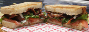 Five slices of thick cut Indiana bacon, lettuce, tomato, spicy mayo on sourdough bread.